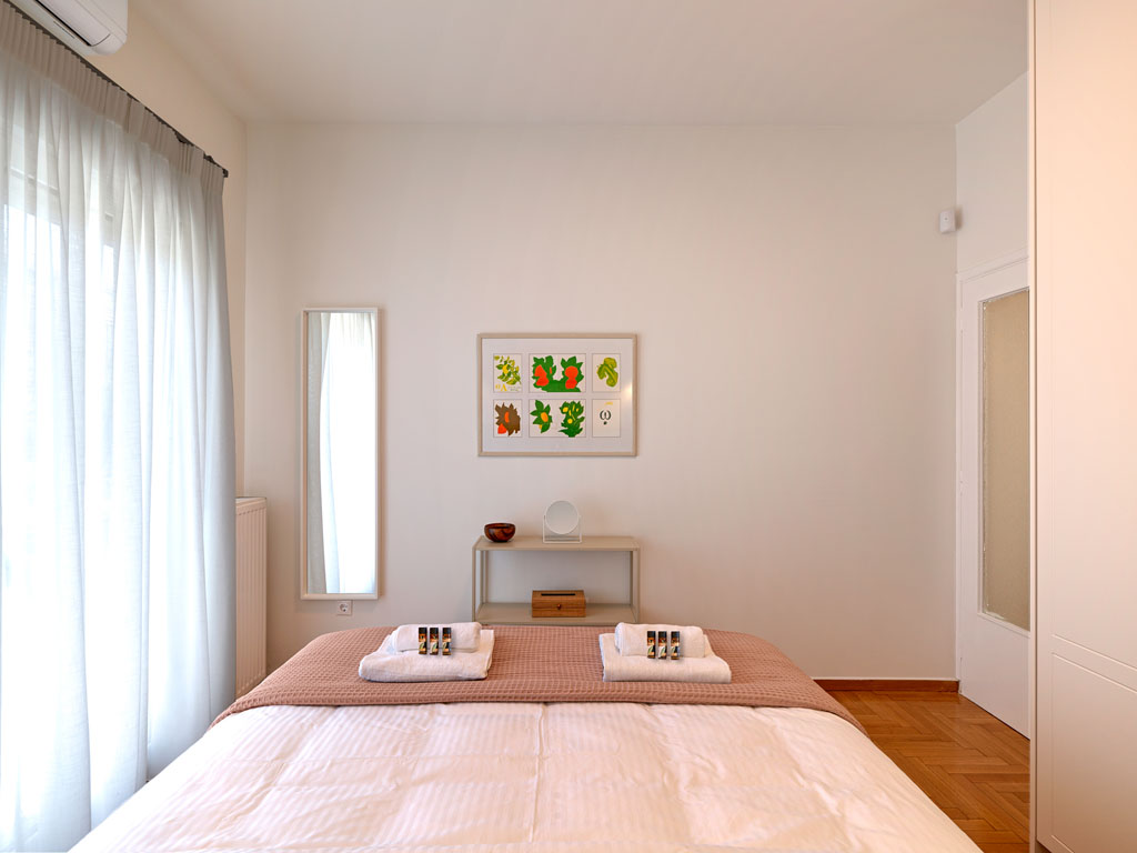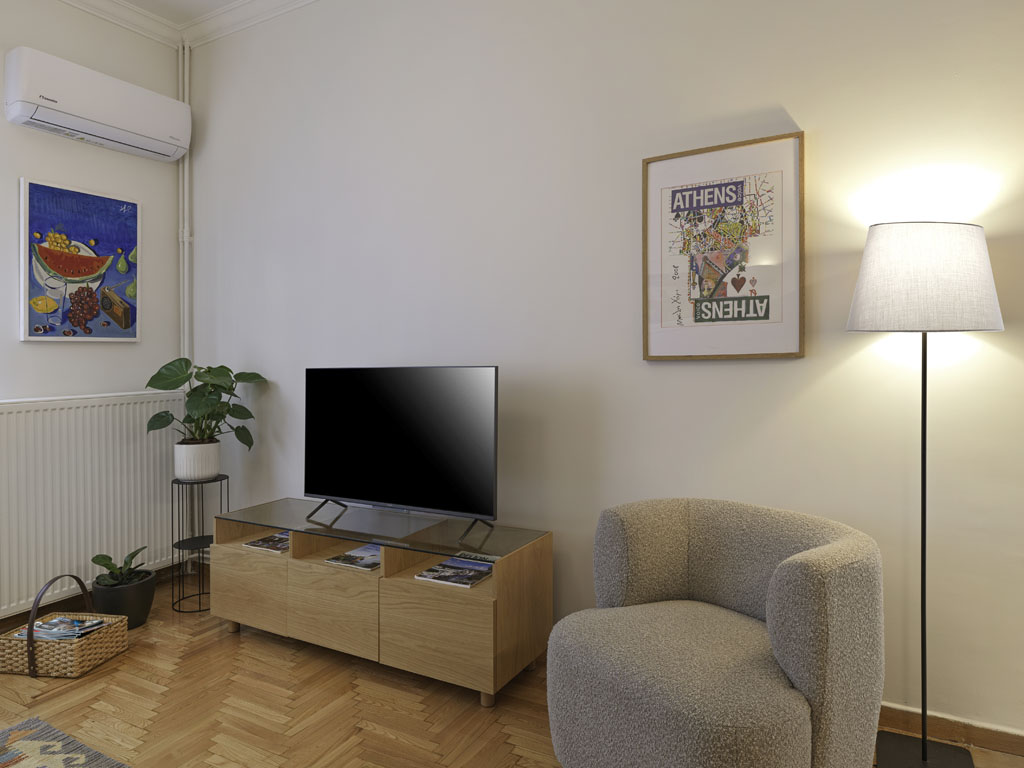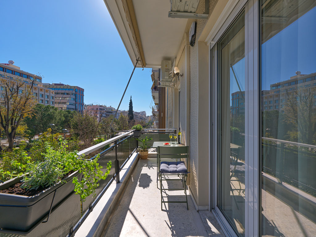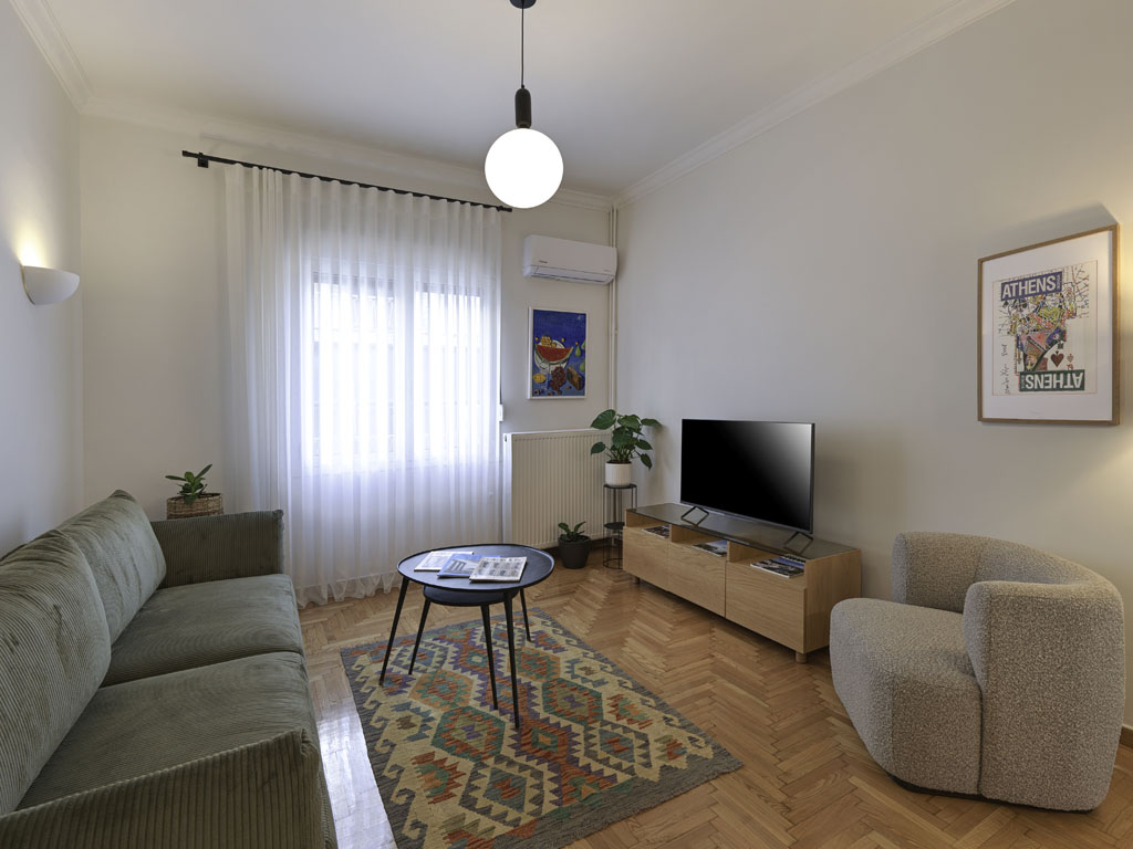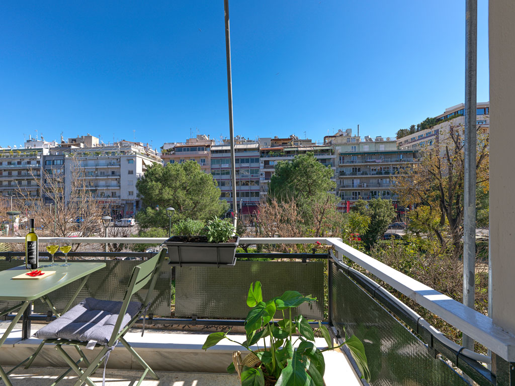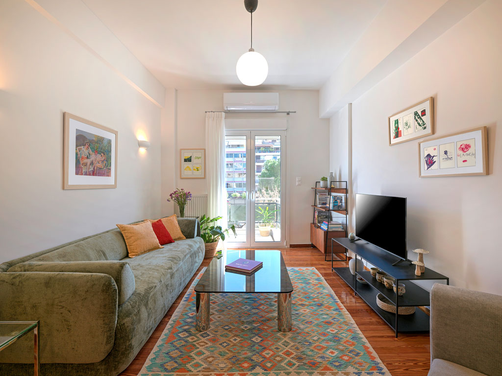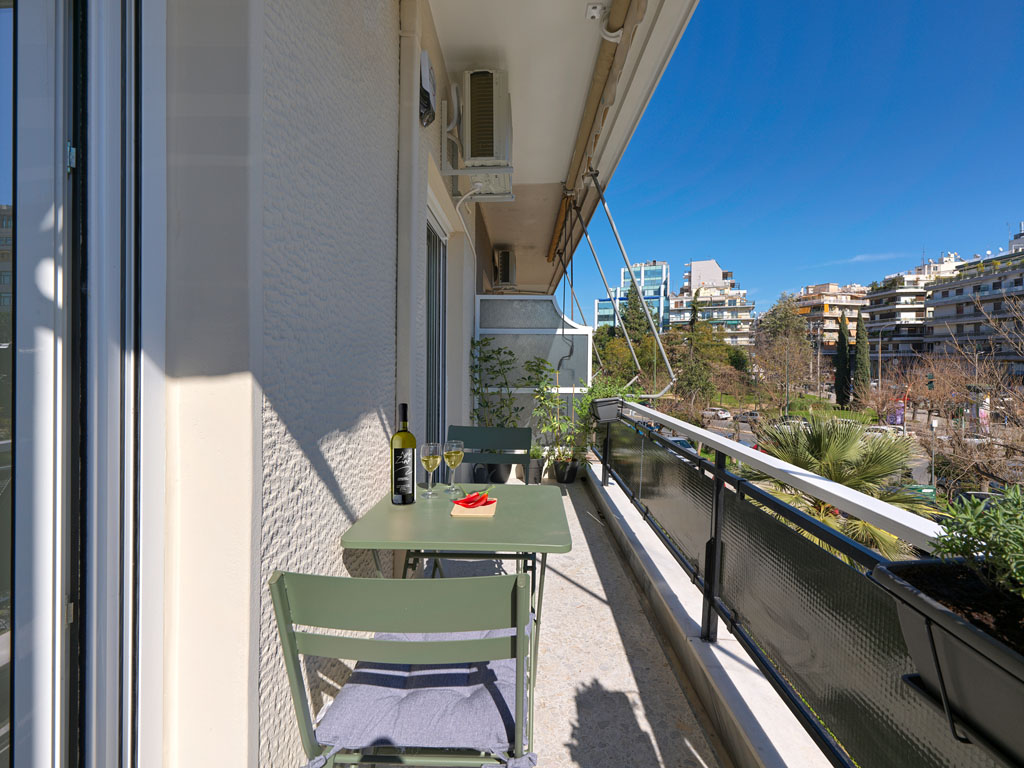The apartment is located on the second floor of the corner building at 21 Meandrou and Aiginitou Streets. It is 59 square meters in size and can accommodate up to 4 people. With independent natural gas heating, air conditioning, free Wi-Fi, a fully equipped kitchen, a washer-dryer, a queen-size bed, and a spacious balcony overlooking the park, it is an ideal choice for a stay in the center of Athens.