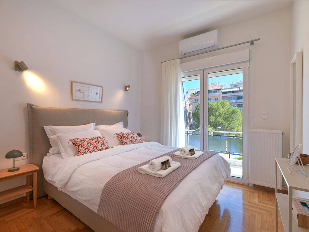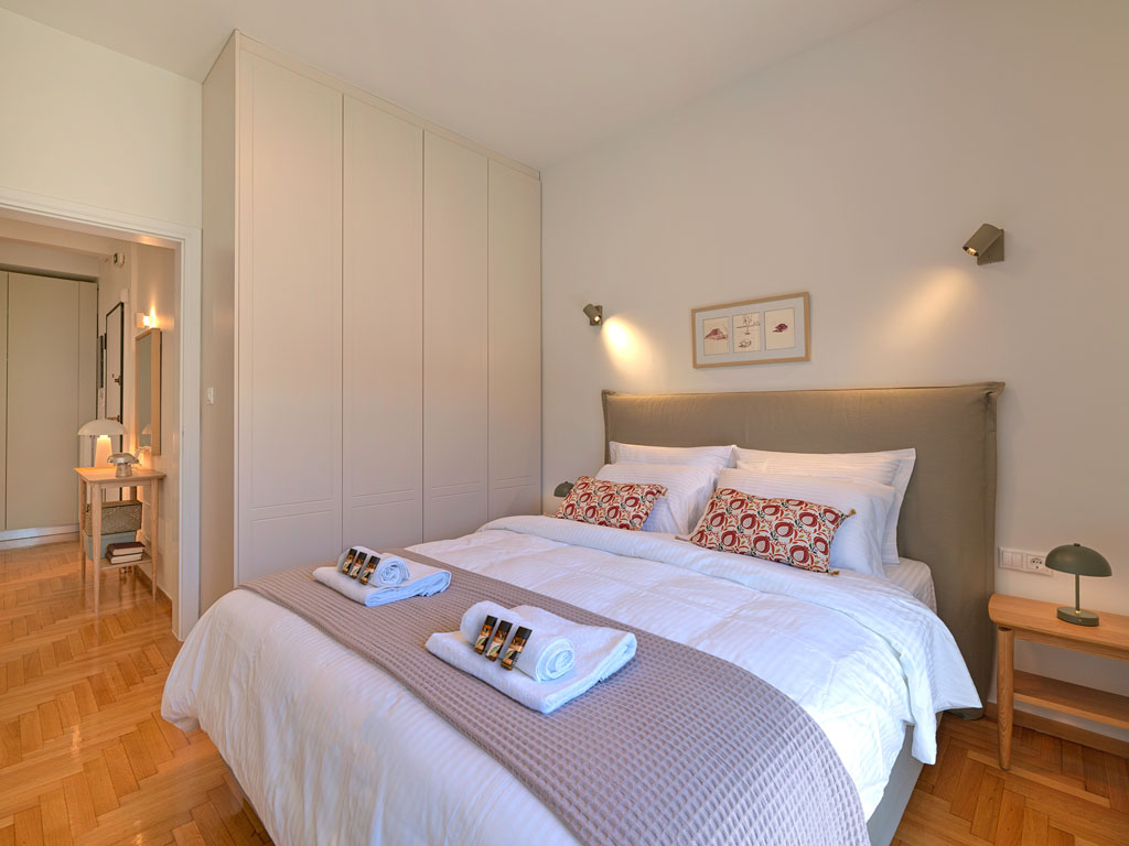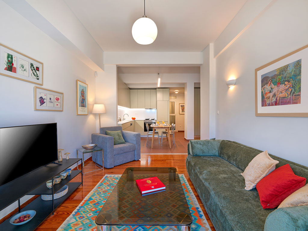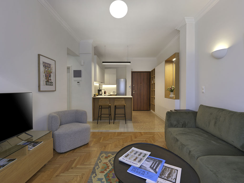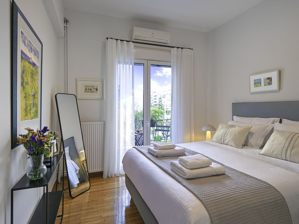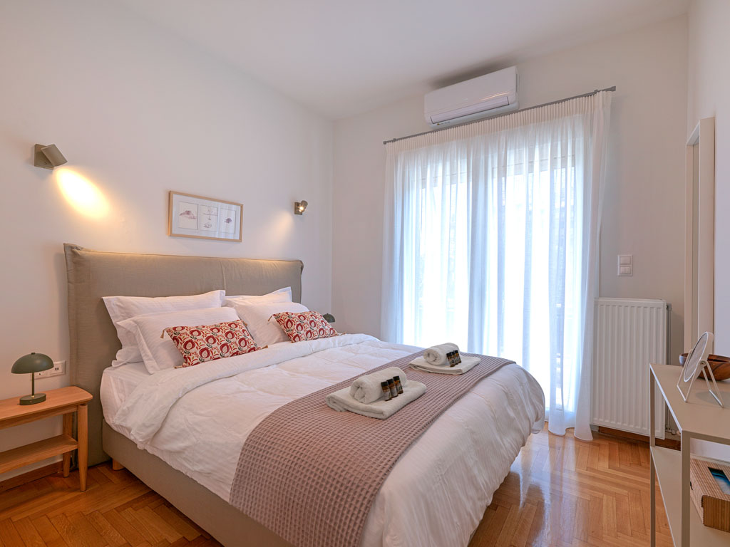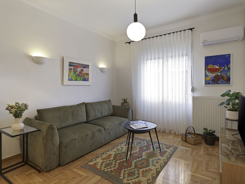 The apartment is located on the second floor of the corner building at 21 Meandrou and Aiginitou Streets. It is 59 square meters in size and can accommodate up to 4 people. With independent natural gas heating, air conditioning, free Wi-Fi, a fully equipped kitchen, a washer-dryer, a queen-size bed, and a spacious balcony overlooking the park, it is an ideal choice for a stay in the center of Athens.